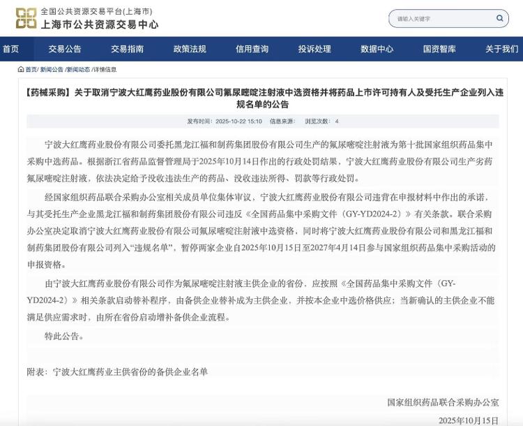 根据公告,联合采购办公室决定取消宁波大红鹰氟尿嘧啶注射液在国家组织药品集中采购中的中选资格。将宁波大红鹰与黑龙江福和制药一同列入“违规名单”。暂停上述两家企业自2025年10月15日至2027年4月14日期间参与国家组织药品集中采购活动的申报资格。