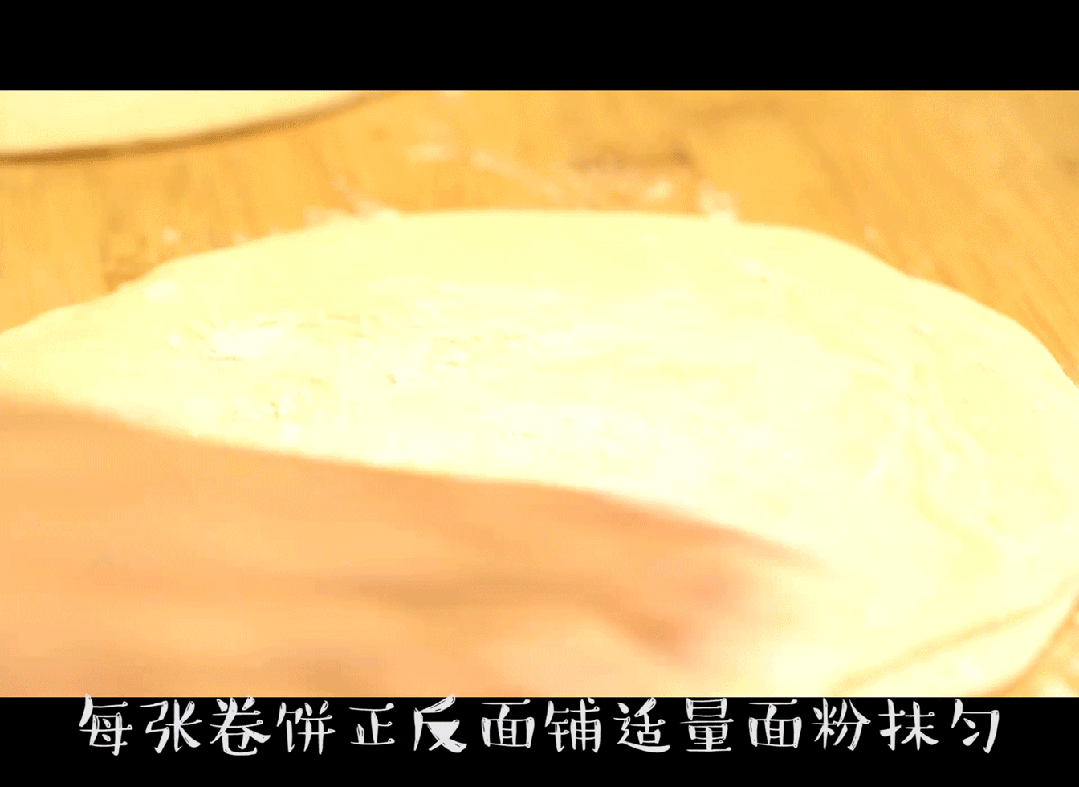 1,每张卷饼正反面铺适量面粉摸匀,三张飞饼摞在一起擀成大片,去掉四周边角,使其更加方正
