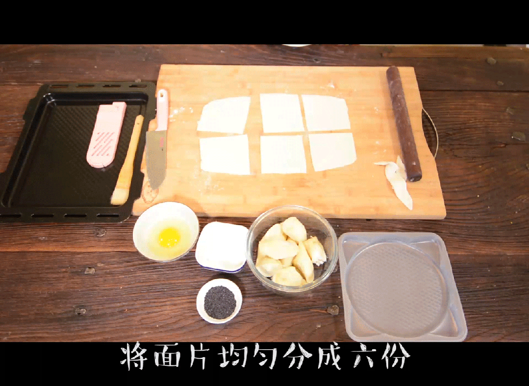 2,将面片均匀分成六份,榴莲肉放到面片上,面片四周刷上蛋液